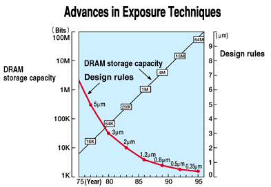 | The growing level of integration and rapidly increasing IC speeds have been achieved by shrinking the size of the circuit elements themselves. Cutting the "design rule" (a measure of process accuracy) by half allows the interconnections between elements to also shrink so that four times as many elements can be incorporated onto the same chip. This results in higher speeds and lower power dissipation.