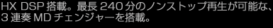 MD/CD/TV/ハンズフリーユニットマルチコントロール オーディオマスター 標準価格 84,000円(税別) ![]() ●音像を前方定位させるDSO機能搭載。 ●45W×4ch。同シリーズ、ワンランク上の高出力を発揮。 ●どのシートにも理想的な音像定位を実現する、タイムアライメント機能採用のリスニングポジションセレクター。 ●振動によるMDの音飛びを防ぐ40秒の音飛びガードメモリー採用。 ●CDの音飛びを防ぐアドバンスドESP採用。 ●スピーカーの性能をフルに引き出す、フロント/リア/サブウーファー独立フィルター。 ●MD信号を20bitまで多ビット化し、量感あるサウンドを再生するワイドビットストリーム。 ●ディスクチェンジをスムーズにおこなうシームレスディスクチェンジ機能搭載。 ●ワンタッチでDSO機能をON/OFFの切り換えが可能な新ワイヤレスリモコン付属。 ![]() ●CD-Rディスクのご使用について ※CDレコーダーで記録したCD-Rディスクは、その特性・傷・汚れなどにより再生でき ない場合があります。 ※CD-Rディスクの取り扱いにあたっては、ディスクの使用上の 注意を必ずお守りください。 ※CD-RW(リライタブル)ディスクは再生できません。 ※ファイナライズ処理されていないCD-Rは再生できないのでご注意ください。