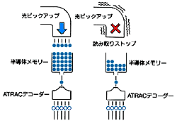 音とびガードメモリーの特長は、ディスクから読みとられたデータをすぐ再生するのではなく、いったん半導体メモリーに蓄えておくところにあります。読みとられたデータは圧縮されているので、半導体メモリーから次にATRACデコーダーに流れていき、そこで圧縮が解かれます。もし、再生時の揺れにより光学ピックアップからのデータの流れが途切れても、半導体メモリーには数秒分の圧縮データが蓄えられているので、ATRACデコーダーには切れ目なく圧縮データが送られていきます。半導体メモリーのデータがなくなる前に光学ピックアップによるデータの読み取りが再開すれば、音とびは発生しないことになります。