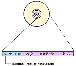 これは曲の情報(開始時刻・終了時刻・順序など)をすべて「ユーザーTOC(Table Of Contents)と呼ばれる領域で管理しているからです。この領域は音楽データとは別に存在しているので、ユーザーTOCの情報を変更するだけで編集が可能になります。たとえば、テープで曲の消去をするためには消したい曲の頭から終わりまで無音で録音しなおさなければなりません。これに対しミニディスクの場合は、ユーザーTOCの情報を書き換えるだけで曲を簡単に消すことができます。