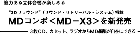 シヤープは、一台でMD、CD、カセット、ラジオが楽しめるミニコンポに、臨場感あふれる立体音響効果をつくりだす“3Dサラウンド”(サウンド・リトリーバル・システム)を搭載したMDコンポ<MDーX3>を発売します。
