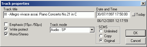 Track properties may be controlled by a right-click from the minidisc track listing. This allows setting of track name, time/date, individual track write protection and even the SCMS settings. The track name can also be entered by double-clicking on that name from the main window. | |