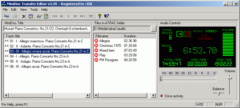The screen (fig 1) provides the primary interface which has been arranged easy and intuitive use. Insert a minidisc into a drive and within seconds the entire track listing will appear in the left hand window. Resize the window if there are a lot of tracks. Click and drag a track up or down to re-arrange the track order. Or drag the track to the PC and initiate a transfer. Double-clicking a track in the PC window starts playback of that track. Rename a track by slow-click on its title in either window. A host of other features are available via right-click context menus such as minidisc track properties where SCMS status can be altered.