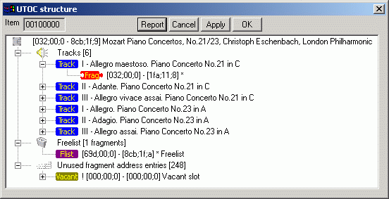 It is possible to reconstruct the TOC from an accidentally, or even deliberately deleted disc and regain the audio from the Minidisc. Minidisc fragment addresses can be directly adjusted through this dialog. For forensic use a comprehensive report is generates giving a thorough breakdown of the structure of the audio data layout on the minidisc. This powerful option requires patience and an understanding of the Minidisc. A tool for the brave, or desperate! |